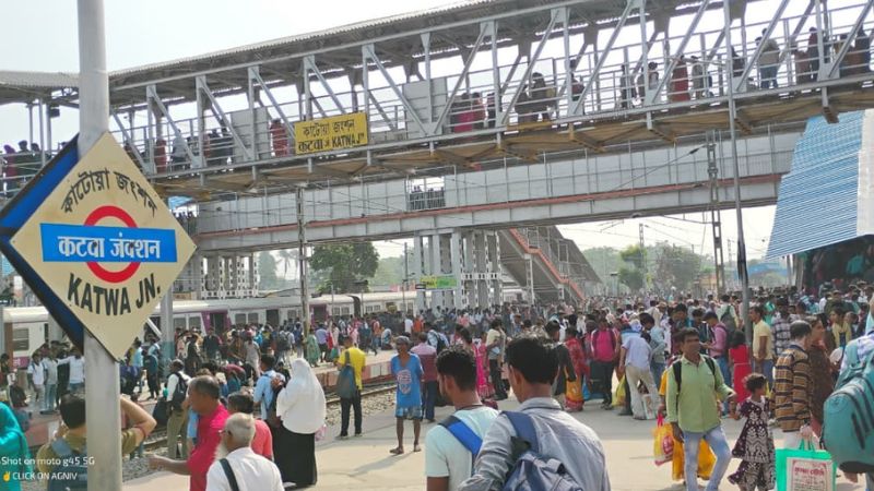 হাওড়া থেকে কাটোয়াগামী ট্রেনগুলি থেকে নামছেন শত শত শ্রমিক। কারো কাঁধে বড় বস্তা, কারো হাতে ধরা ছোট শিশুর হাত। মূলত কেরালা, মহারাষ্ট্র, দিল্লি এবং কর্ণাটকের মতো রাজ্যগুলোতে শ্রমিকের কাজ করতে যাওয়া মানুষগুলো এখন বাড়ির পথে। কাটোয়া স্টেশন থেকে মুর্শিদাবাদগামী সংযোগকারী ট্রেনগুলিতে ওঠার জন্য রীতিমতো হুড়োহুড়ি পড়ে যাচ্ছে।